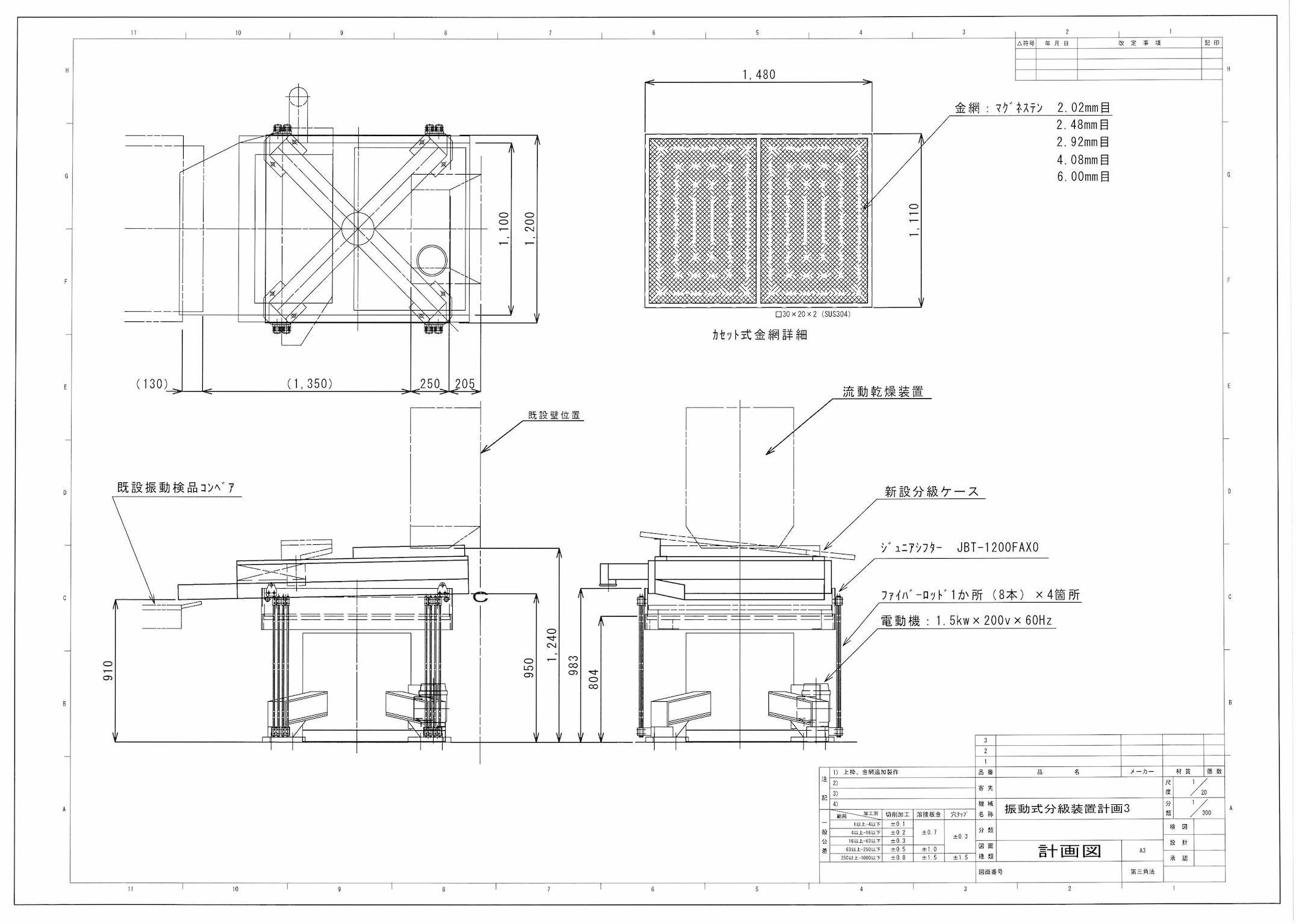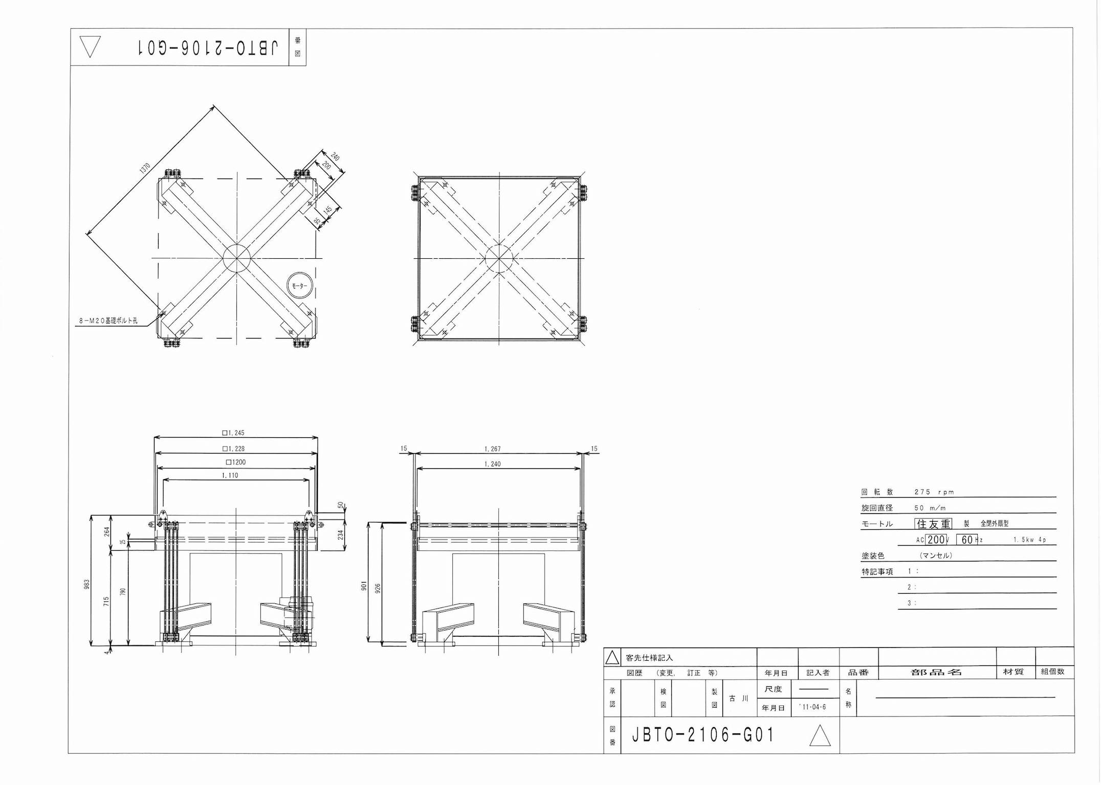 Works業務内容 設計制作 納品までの流れ 項目をクリックすると詳細が表示、画像にマウスカーソルを合わせると拡大表示する事が出来ます。 1.注文 2.組立図・納品予定図 ご依頼内容により機種などを選定 3.現地最終確認・工程表作成 選定機種にて設計検討 (現地調査、採寸など) 4.工程表・入稿申請・納入図提出 現地調査で得られた情報を図面化 設計計画に基づいて、更新完了までの見積り、及び工期などを検討 お客様に提出、承認確認 納入予定図、工程提出 5.製作・購入品・工事段取開始 ご協力頂いている業者様宛に製缶 ※製缶とは製作、購入品手配、製作工程管理の一連の流れを指します 6.納入前完成検査 終了にて、仮組立、納入前確認 (サンプル等でのテストを含む) 検査 重量、組立、配管、電気、制御工事 ※(要)立合願います 7.要望事項修正・改造 より良い装置を納入する為にユーザーに寄り添った対応を心掛けています 8.納入前再検査 ※(要)立合願います 9.据付・組立工事 現地納入、更新工事 (業者様と協力して施工) 10.納入後確認 更新工事完了 (試運転調整、処理状態、異音等の不具合) 不具合、ご要望等の対策、対応 11.納入承認・図書提出 検収確認 (完成検査、引き渡し、図書提出)